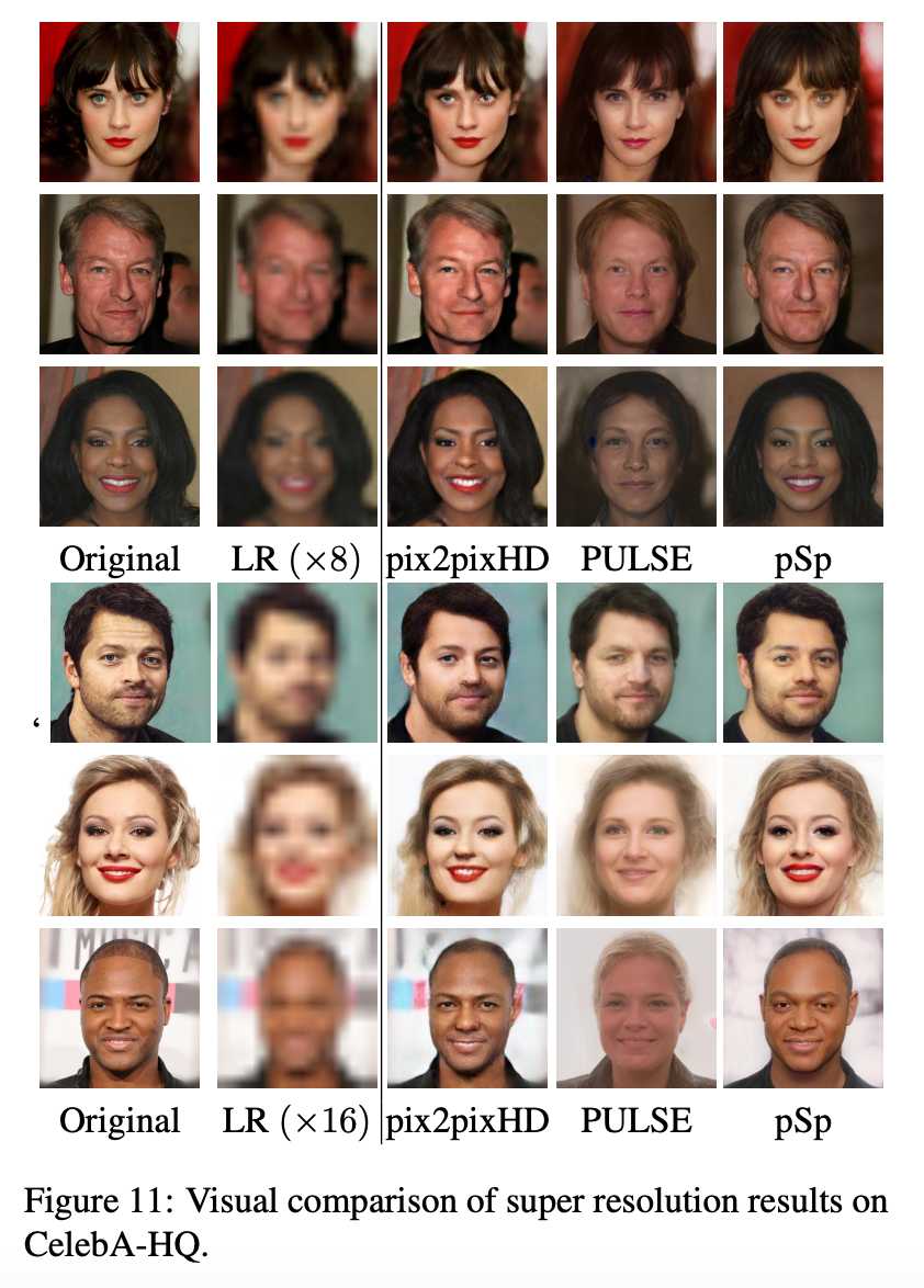 研究显示,pSp方法可以根据相应的低分辨率(LR)输入图像来构建高分辨率(HR)面部图像。下图11展示了使用该方法与以往方法的生成图像的视觉对比效果:
