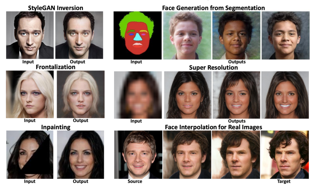 pSp可应用于基于分割图的人脸生成、超分辨率任务、图像修复等任务。