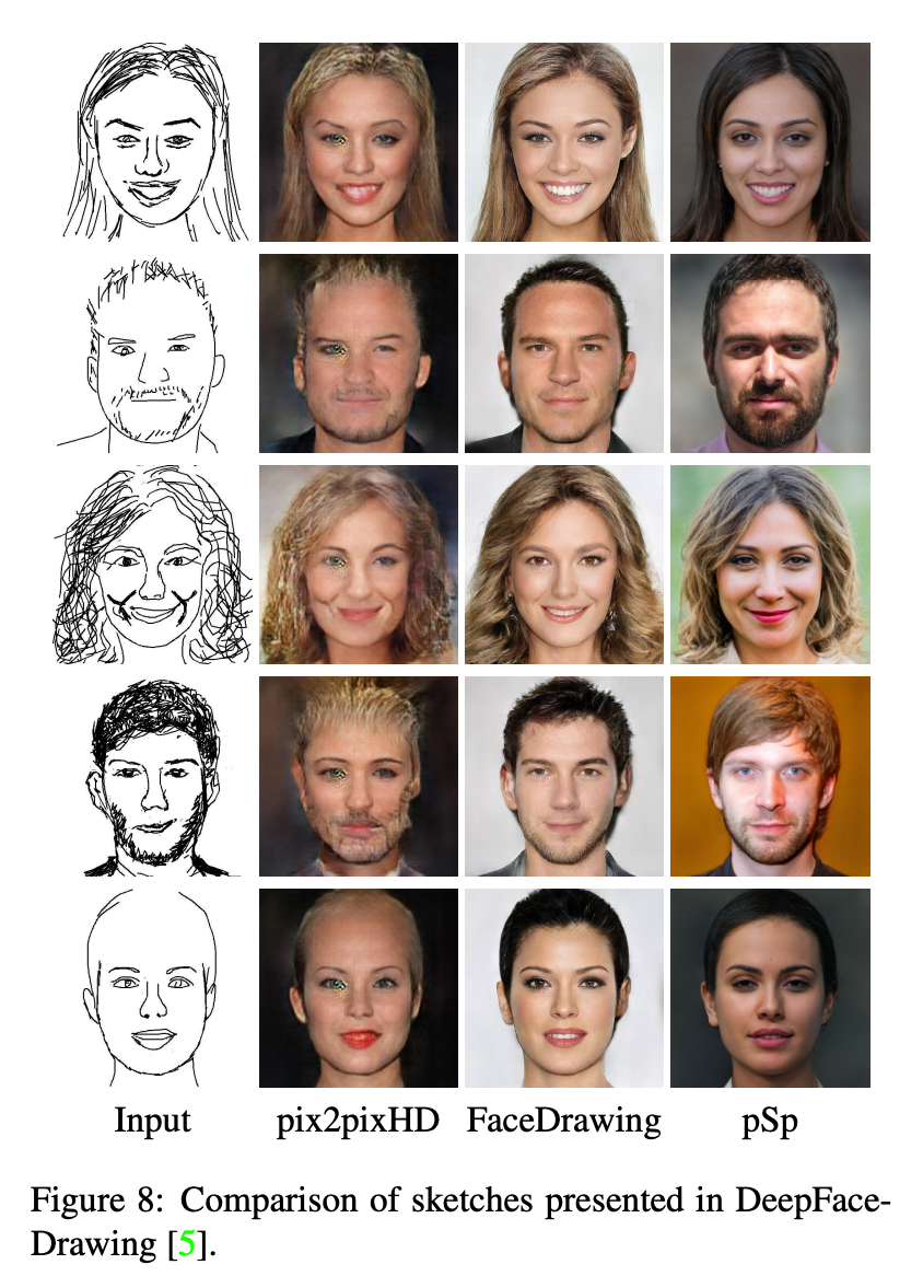 对于基于草图生成高质量人脸图像任务,该研究对pSp、pix2pixHD、DeepFaceDrawing进行了对比,pSp实现了不错的效果: