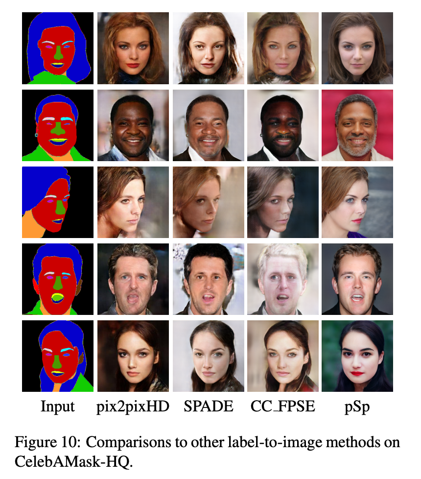 对于基于分割图生成人脸图像的任务,研究者在CelebAMask-HQ数据集(包含19个语义类别)上对pix2pixHD、SPADE、CC_FPSE和pSp进行了对比: