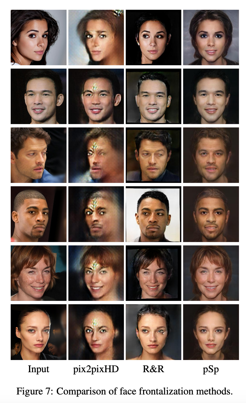 由实验结果可以看出,当用相同的数据训练时,pix2pixHD无法收敛到令人满意的结果,因为它更依赖于输入和输出对之间的对应关系。而pSp能够很好地处理任务,生成逼真的脸部正面图像,与更复杂的RotateAndRender(R&R)方法效果相当。