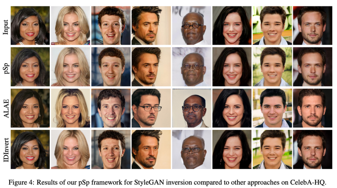 下图4展示了不同方法在CelebA—HQ数据集上的对比。实验结果表明,pSp方法能够在保留图像身份的同时重建细节,如面部光线、发型和眼镜等。