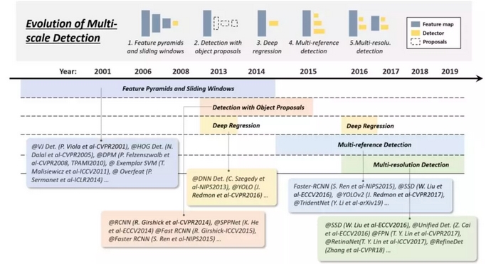 多尺度检测(Multi-scale detection)对象的 “ 不同尺寸 ” 和 “ 不同纵横比 ” 是目标检测的主要技术难题之一。近20年来,多尺度检测经历了多个历史时期:“ 特征金字塔和滑动窗口(2014年前) ”,“ 基于对象建议的检测(2010-2015年) ”,“ 深度回归(2013-2016) ”、“ 多参考检测( multi-reference detection,2015年后 ) ”、“ 多分辨率检测( multi-resolution detection,2016年后 ) ”,如下图所示:
