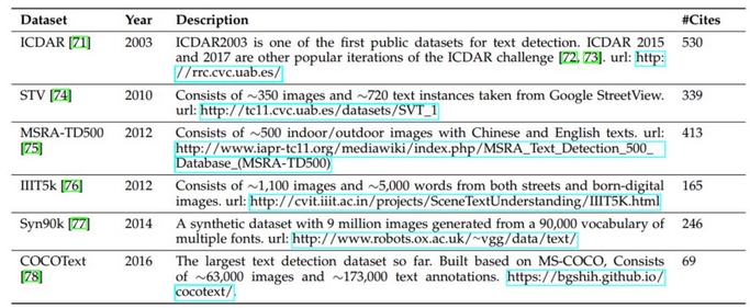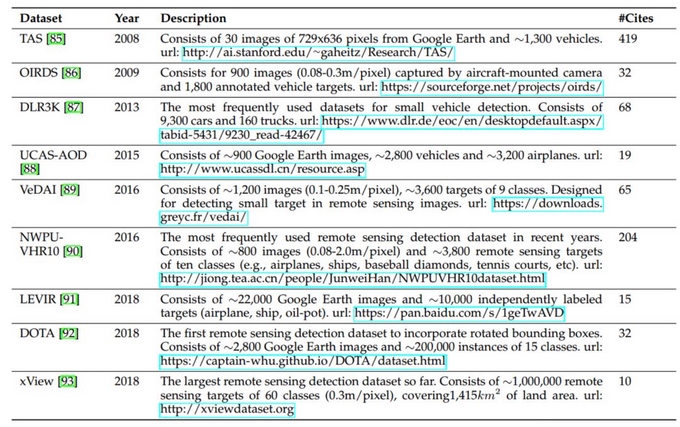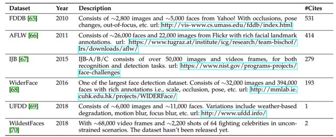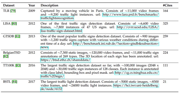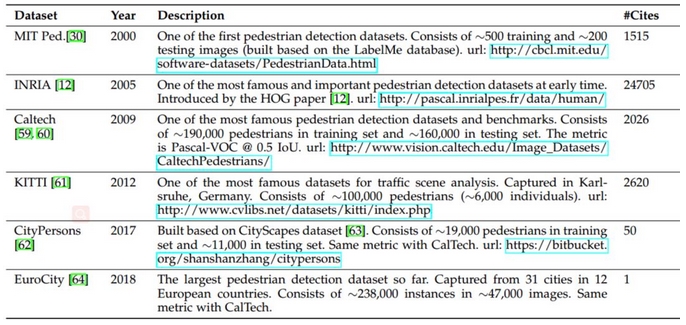在过去的20年里,除了一般的目标检测外,在行人检测、人脸检测、文本检测、交通标志/灯光检测、遥感目标检测等特定领域的检测应用也十分繁荣。下面一系列表列出了这些检测任务的一些流行数据集。有关这些任务的检测方法的详细介绍可在后期分享中找到。