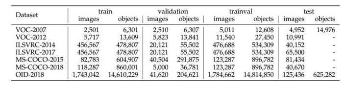 建立具有更少的偏置的更大的数据集,是开发先进的计算机视觉算法的关键。在目标检测方面,在过去10年中,已经发布了许多著名的数据集和基准测试,包括PASCAL VOC挑战的数据集(例如,VOC2007, VOC2012)、ImageNet大尺度视觉识别挑战(例如,ILSVRC2014)、MS-COCO检测挑战等。下表1给出了这些数据集的统计数据。