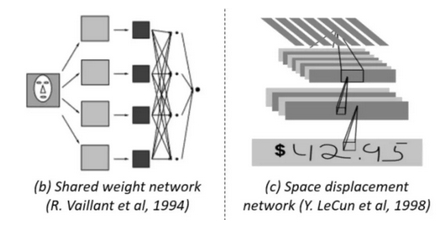 使用CNN检测物体的历史可以追溯到20世纪90年代,当时Y. LeCun等人做出了巨大的贡献。由于计算资源的限制,当时的CNN模型比现在的模型要小得多,也要浅得多。尽管如此,在早期基于CNN的检测模型中,计算效率仍然被认为是难以破解的难题之一。Y. LeCun等人进行了一系列改进,如 “ 共享权值复制神经网络(shared-weight replicated neural network) ”和“ 空间位移网络(space displacement network)”通过扩展卷积网络的每一层,覆盖整个输入图像,减少计算量,如下图(b)-(c)所示。
