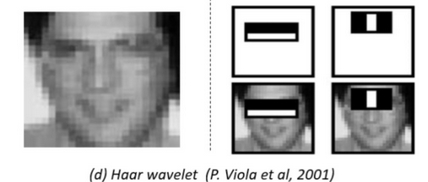 自2000年以来,小波特征变换开始主导视觉识别和目标检测。这组方法的本质是通过将图像从像素点转换为一组小波系数来学习。其中,Haar小波由于其计算效率高,被广泛应用于一般目标检测、人脸检测,行人检测等目标检测任务中。下图(d)为VJ检测器学习到的一组用于人脸的Haar小波基。