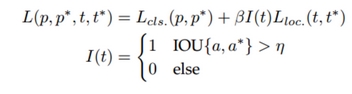其中t和t*是predicted和ground-truth的边界框的位置,p和p*是它们的类别概率。IOU{a,a*}是锚框a和它ground-truth a*之间的IOU。η是一个IOU阈值,比如0.5。如果锚框没有覆盖任何对象,其定位损失不计入最终损失。