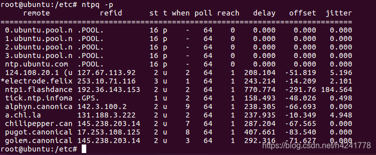ntpq是ntpd的查询工具。 -p标志要求提供有关ntpd连接到的NTP服务器(或页面)的信息。 您的输出会略有不同,但应列出默认的Ubuntu池服务器以及其他一些服务器。 请记住,ntpd建立连接可能需要几分钟时间。