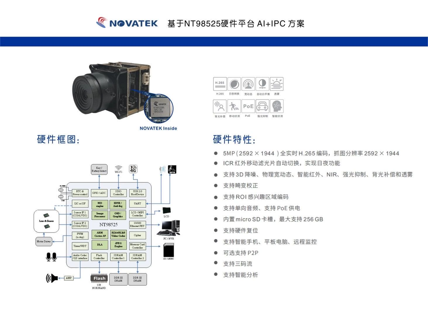 联咏Novatek NT98525是一款高集成度的SoC,具有高图像质量、低比特率、低功耗的特点,目标是4Mp到5Mp边缘计算IP摄像机的应用。SoC集成 ARM Cortex A9 CPU核,新一代ISP,H.265/H.264视频压缩编解码器,高性能硬件DLA模块、图形引擎、显示控制器、以太网PHY、USB 2.0、音频编解码器、RTC和SD/SDIO 3.0,可提供最佳性价比的边缘计算IP摄像机解决方案。