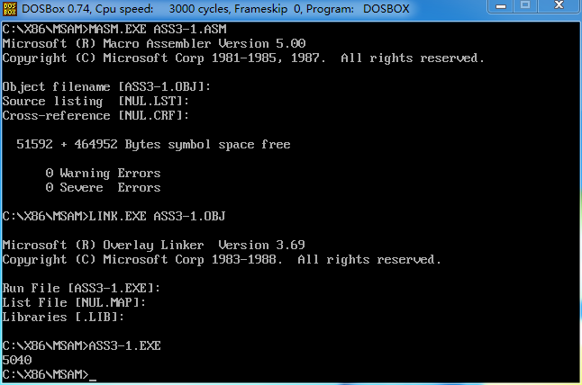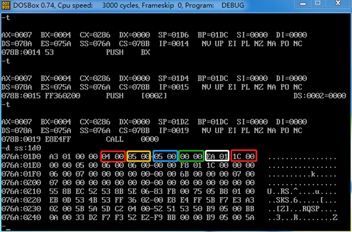 中间一直困扰我的就是在子程序中获取参数N的方式MOV BX,[BP+6],为什么是BP+6呢?我们来看,BP保存的是子程序中的SP指针,但是距离我们将N压栈之间,我们经历了:将RESULT压栈、调用时将调用处的IP+2压栈以及将BP压栈,三个过程。因此当前的BP和N之间相差了6个字节的距离,故采用[BP+6]的方式进行参数N的寻址