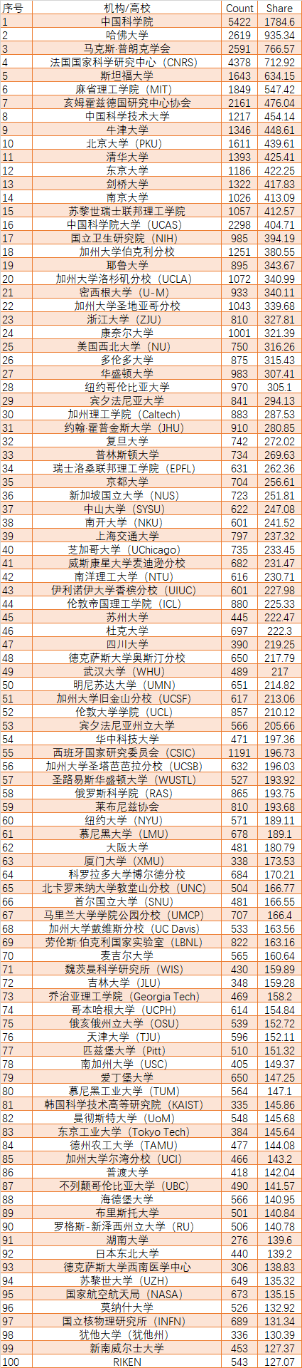 • 论文计数 (article count/AC) - 不论一篇文章有一个还是多个作者,每位作者所在的国家或机构都获得1个AC分值。