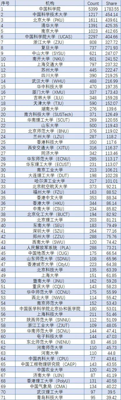 排名前10名的中国大学分别是中国科学技术大学、北京大学、清华大学、南京大学、中国科学院大学、浙江大学、复旦大学、中山大学、南开大学和上海交通大学。