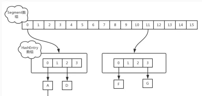 JDK 1.7 中,采用分段锁的机制,实现并发的更新操作,底层采用数组+链表的存储结构,包括两个核心静态内部类 Segment 和 HashEntry。