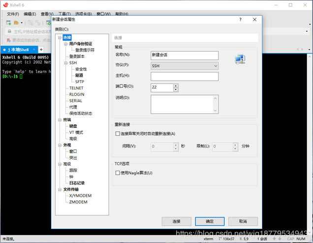 新建回话栏可以随意填写,主机栏填写的是卡莉的IP地址(查看方法为:在终端中输入的ifconfig)