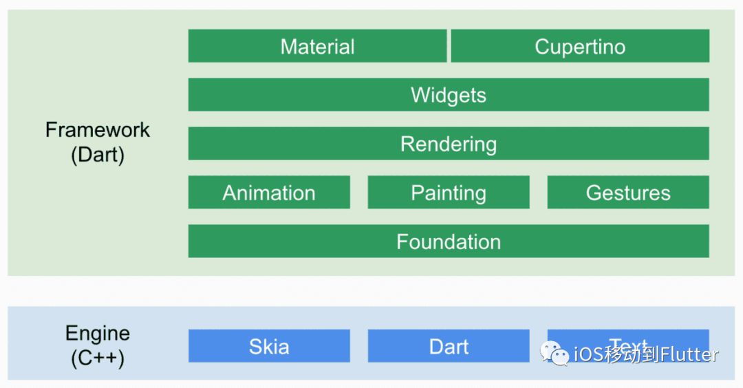 一. FlutterUI整体架构 跨平台应用的框架,没有使用WebView或者系统平台自带的控件,使用自身的高性能渲染引擎(Skia)自绘,界面开发语言使用dart,底层渲染引擎使用C, C++。