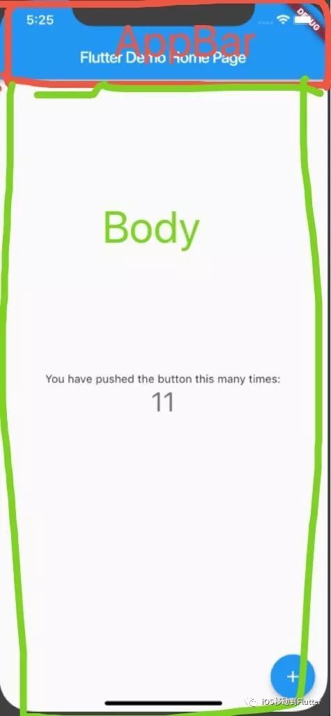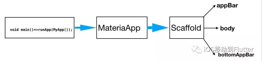 看一下demo代码: MaterialApp包裹 MyHomePage, MyHomePage包裹着 Scaffold, Scaffold包裹着 AppBar和 body也可以增加 bottomNavigationBar等。