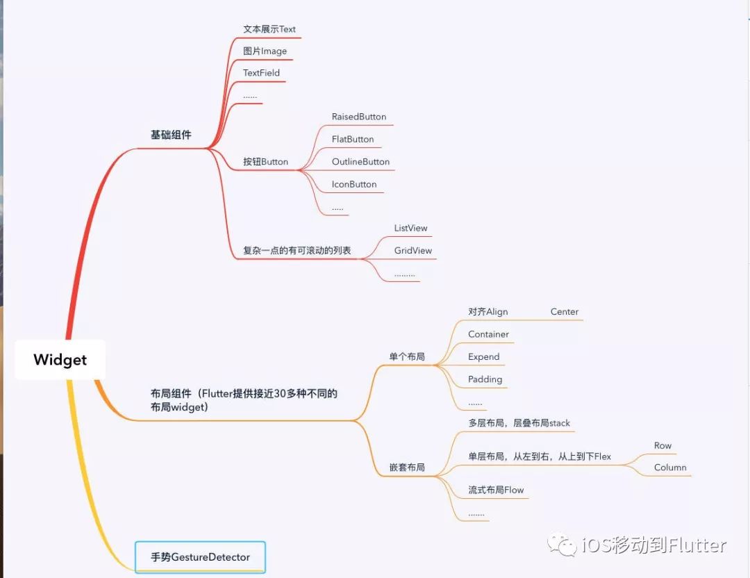 Flutter设计思想是一切皆是Widget,包括UI基础控件,布局方式,手势等都是widget。