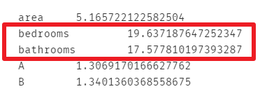 发现bedrooms和bathrooms存在强相关性,可能这两个变量是解释同一个问题,方差膨胀因子较大的自变量通常是成对出现的。