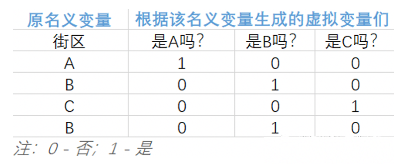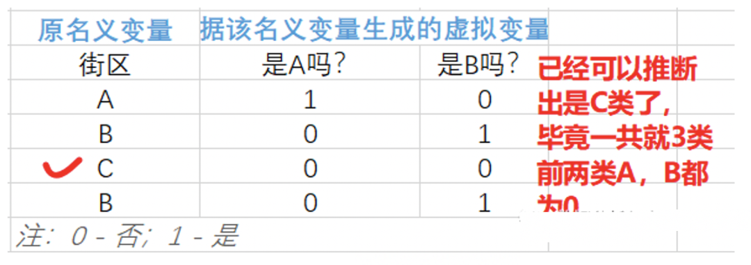 巧妙的使用 0 和 1 来达到 「用虚拟变量列代替原名义变量所在类别」