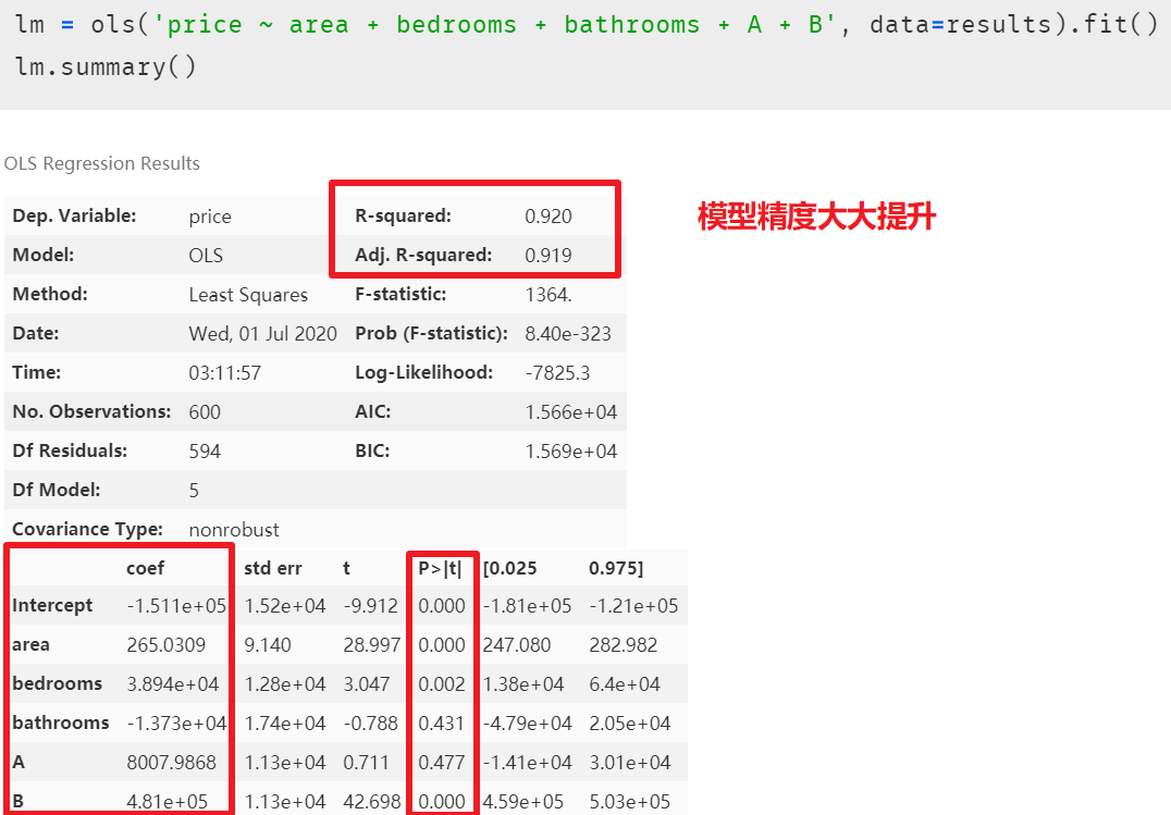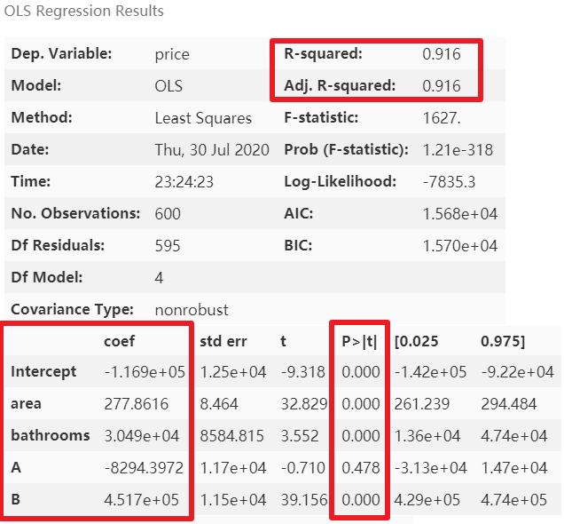 lm = ols(formula='price ~ area + bathrooms + A + B', data=results).fit()