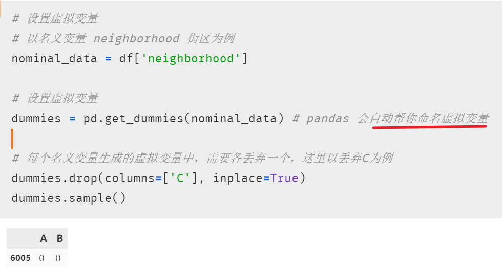 接下来要做的就是将生成的虚拟变量们放入多元线性回归模型,但要注意的是:「转化后的虚拟变量们需要舍弃一个」,才能得到满秩矩阵。具体原因和有关线性代数的解释可以查看笔者打包好的论文,我们可以理解为,当该名义变量可划分为 n 类时,只需要 n-1 个虚拟变量就已足够获知所有信息了。该丢弃哪个,可根据实际情况来决定。