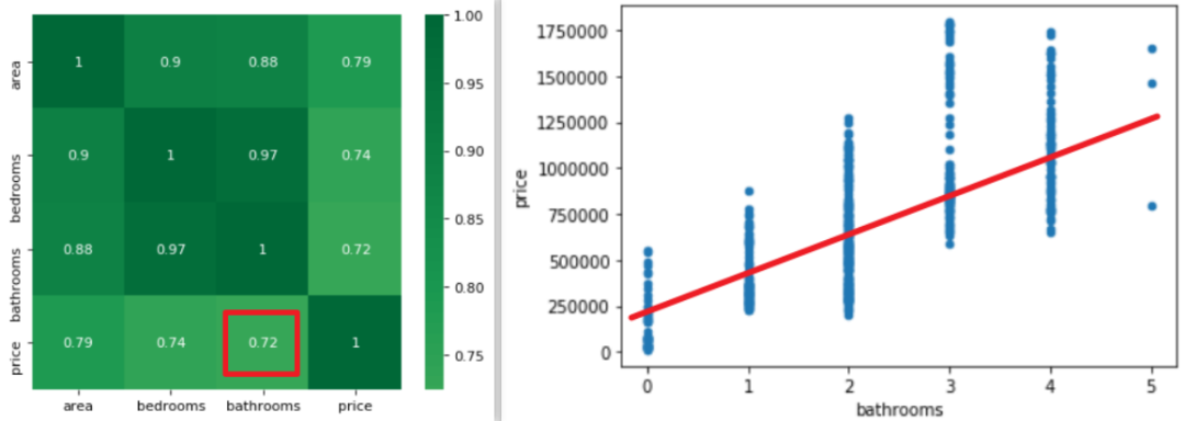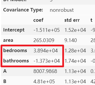 可以很明显的看出,bathrooms的参数很可能是有问题的,怎么可能bathrooms的数据量每增加一个,房屋总价还减少 1.373*10 的四次方美元呢?简单的画个散点图和热力图也应该知道房屋总价与bathrooms 个数应该是成正比例关系的。