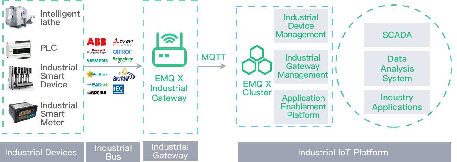 EMQ X提供的从工业网关到平台的整体解决方案,支持主流工业总线协议与厂商协议,可以快速接入工业设备;在平台端为工业物联网应用提供在云端的工业设备数据接入、数据存储以及提供和云端组态和应用的对接,方便工业互联网应用的快速开发。
