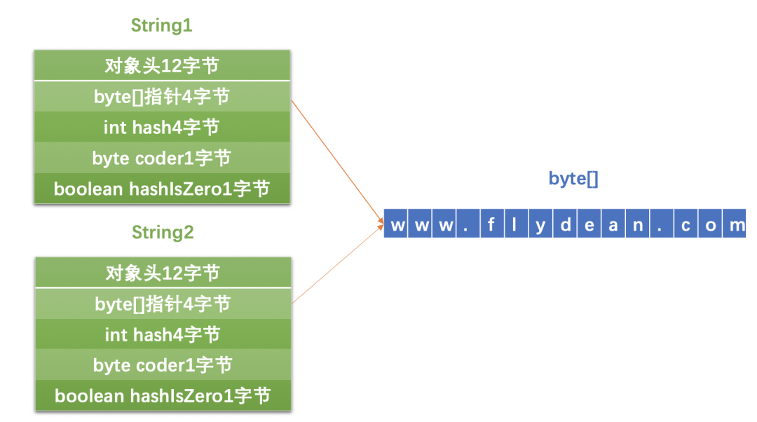 而G1垃圾回收器的字符串去重的功能其实和String.intern有点不一样,G1是让两个字符串的底层指向同一个byte[]数组。
