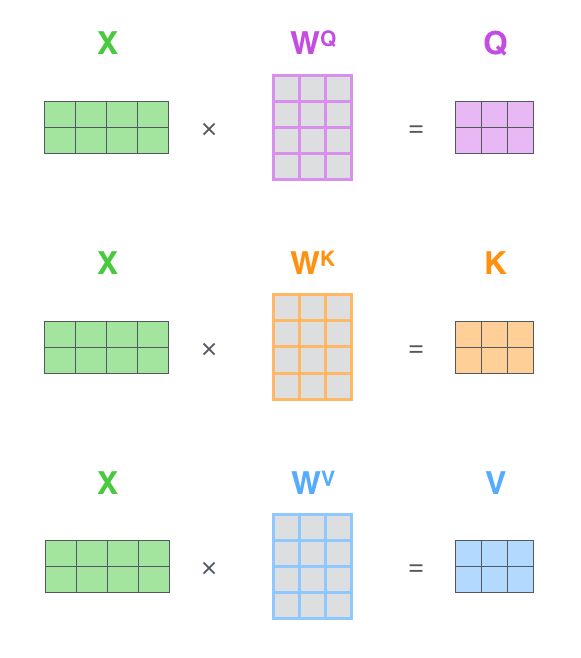 如果将输入的所有向量合并为矩阵形式,则所有query, key, value向量也可以合并为矩阵形式表示