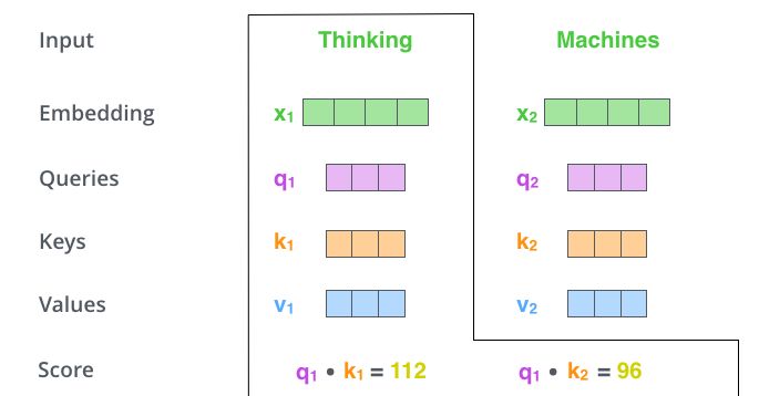 分别代表Thinking以及Machines对应的key vector,则计算Thinking的attention score的时候我们需要计算