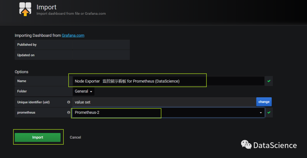 这里导入的数据源非彼数据源 ,而是用 grafana画好的 dashborad