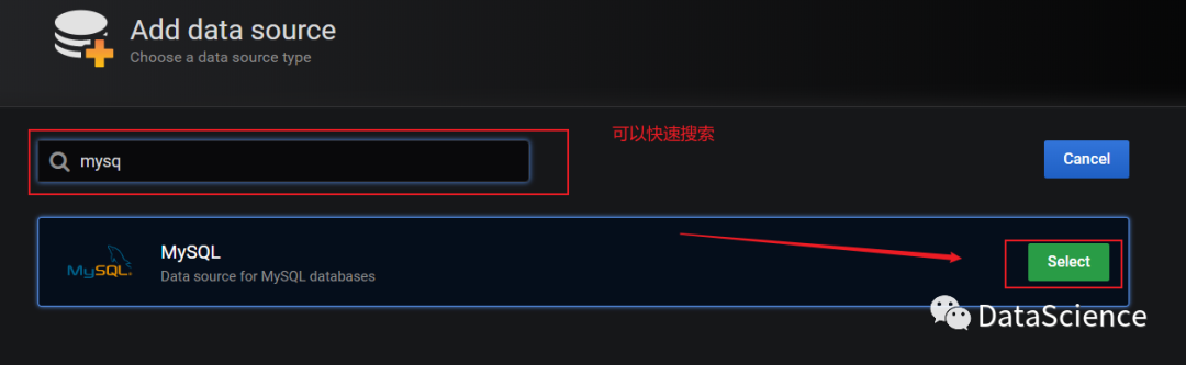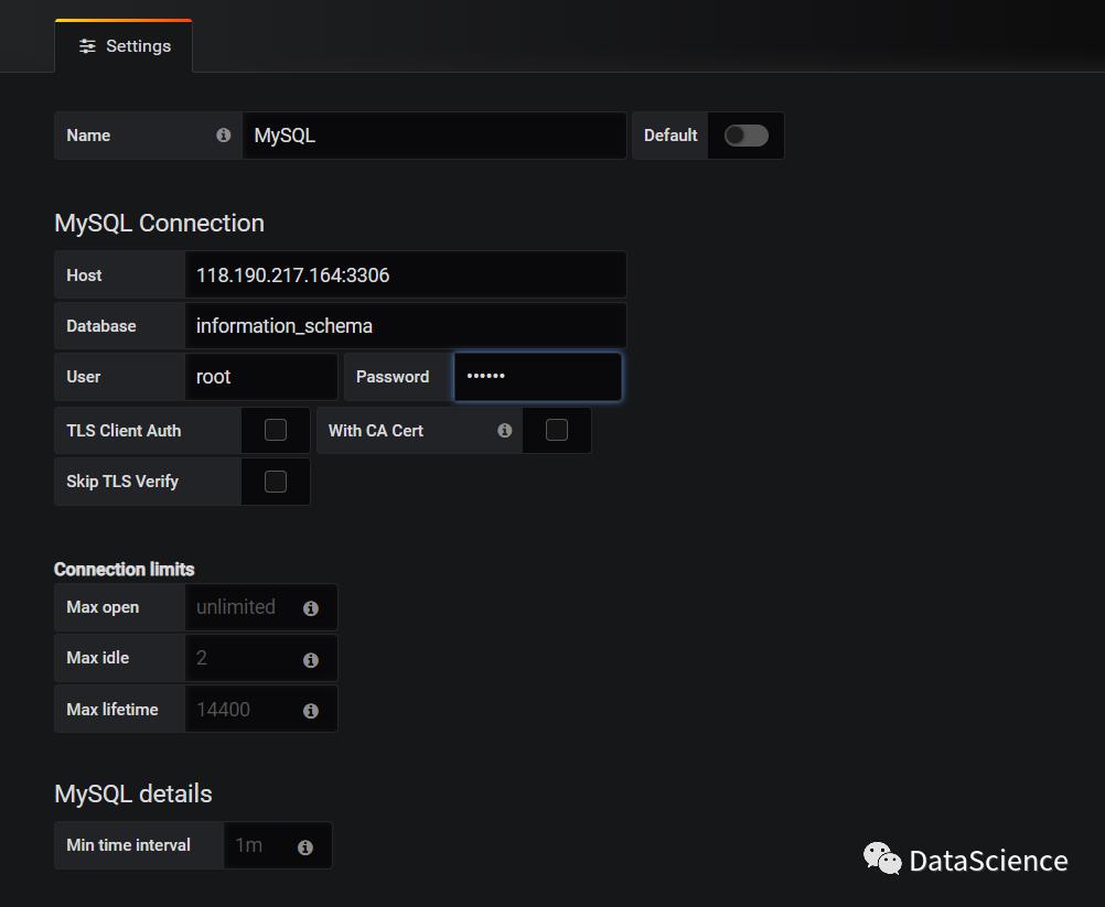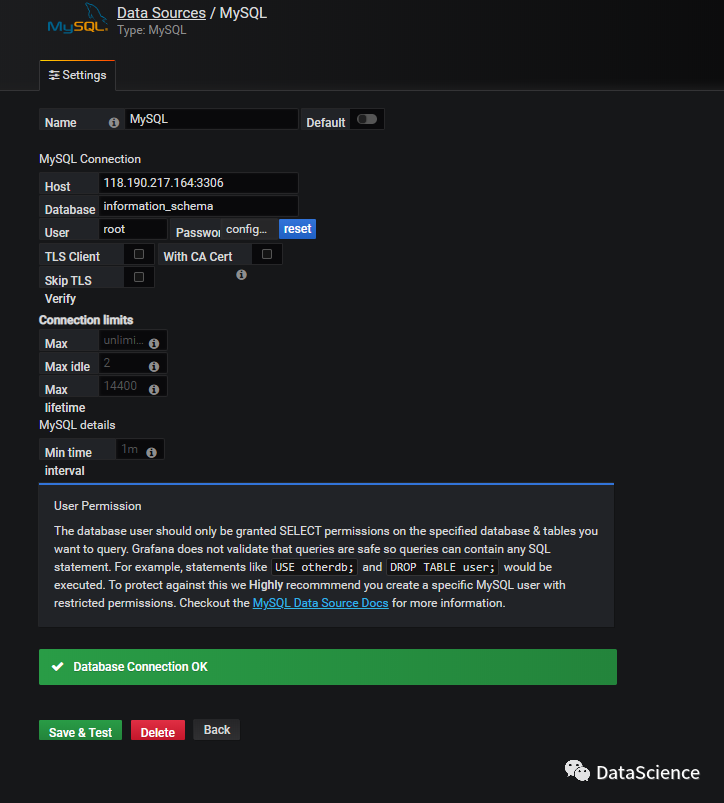 5、设置数据源 grafana界面添加`mysql数据源