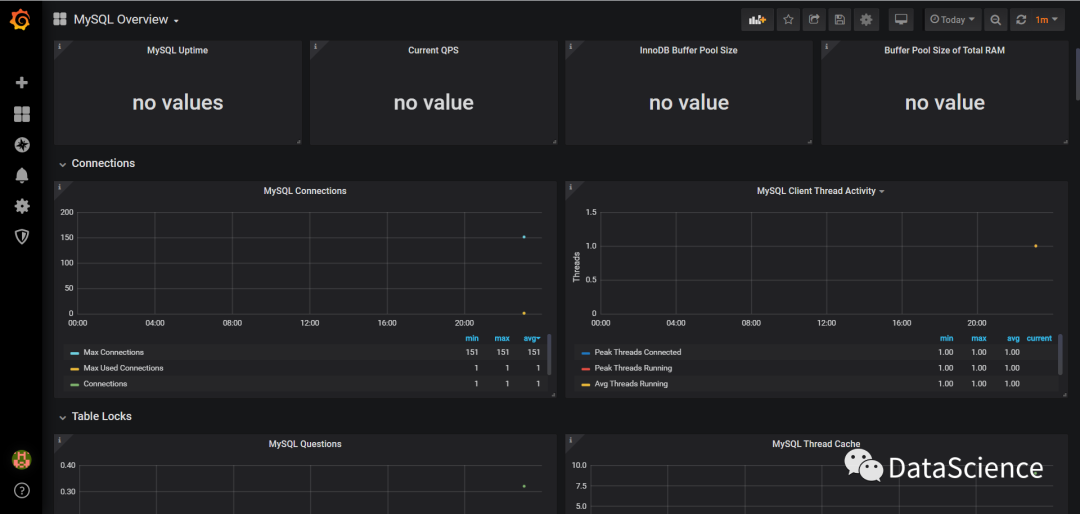 6、导入配置好的dashboard,数据源选择mysql数据源即可。(刚安装的所以信息较少)