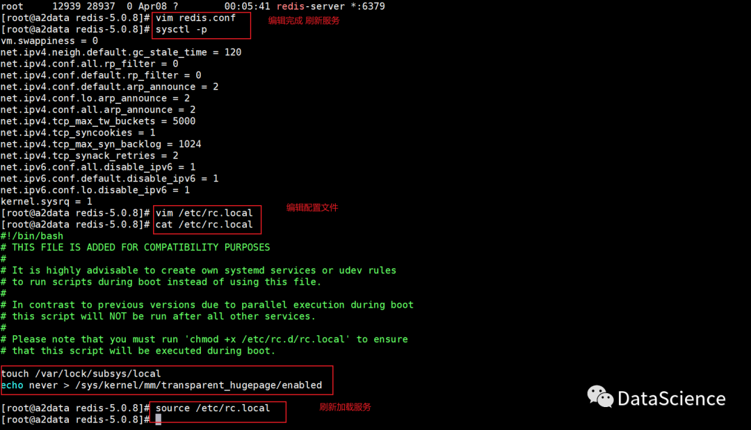 echo never > /sys/kernel/mm/transparent_hugepage/enabled添加到/etc/rc.local中,然后执行source /etc/rc.local生效配置。