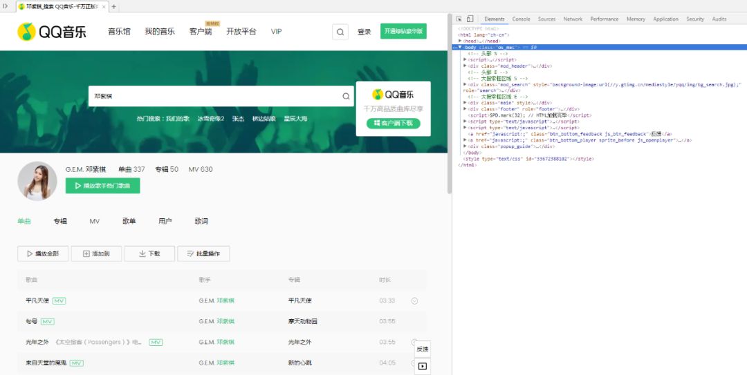5.分析网页源代码 Elements,发现无歌曲信息,无法使用 BeautifulSoup,如下图所示,结果为空。