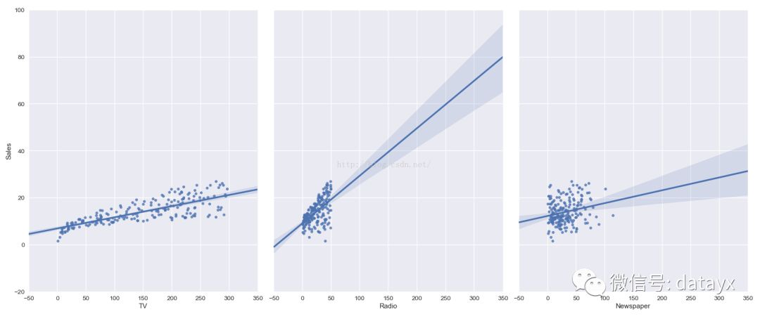 seaborn的pairplot函数绘制X的每一维度和对应Y的散点图。通过设置size和aspect参数来调节显示的大小和比例。可以从图中看出,TV特征和销量是有比较强的线性关系的,而Radio和Sales线性关系弱一些,Newspaper和Sales线性关系更弱。通过加入一个参数kind='reg',seaborn可以添加一条最佳拟合直线和95%的置信带。