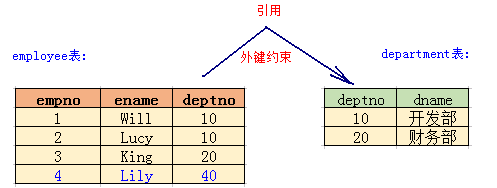 规定: employee表中的deptno列的值,应该来源于department表中的主键列deptno,