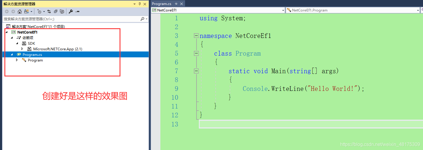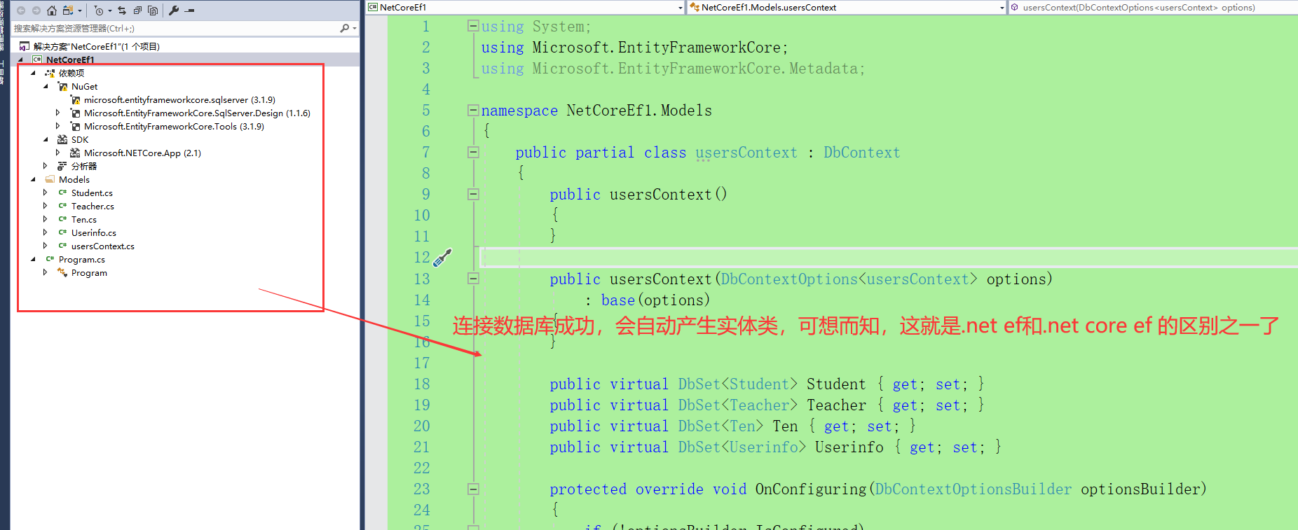 这样一个简单的小demo 就完事了,这个例子代码上.net core ef和.net ef上没什么区别的,就是.net core ef需要手动去安装和连接数据库,而.net ef连接数据库用Model First、DBFirst、Code First的话,web.config里面就自动生成连接的。