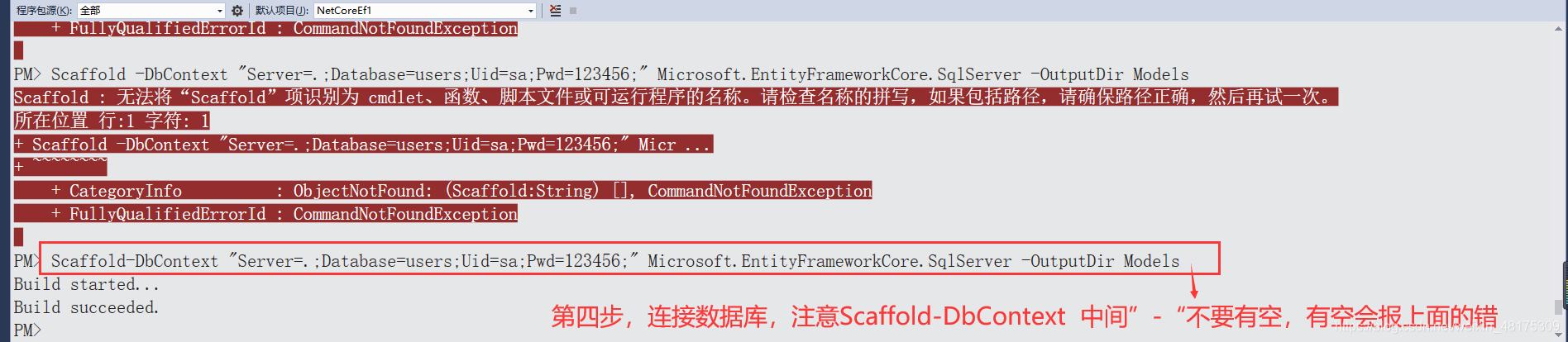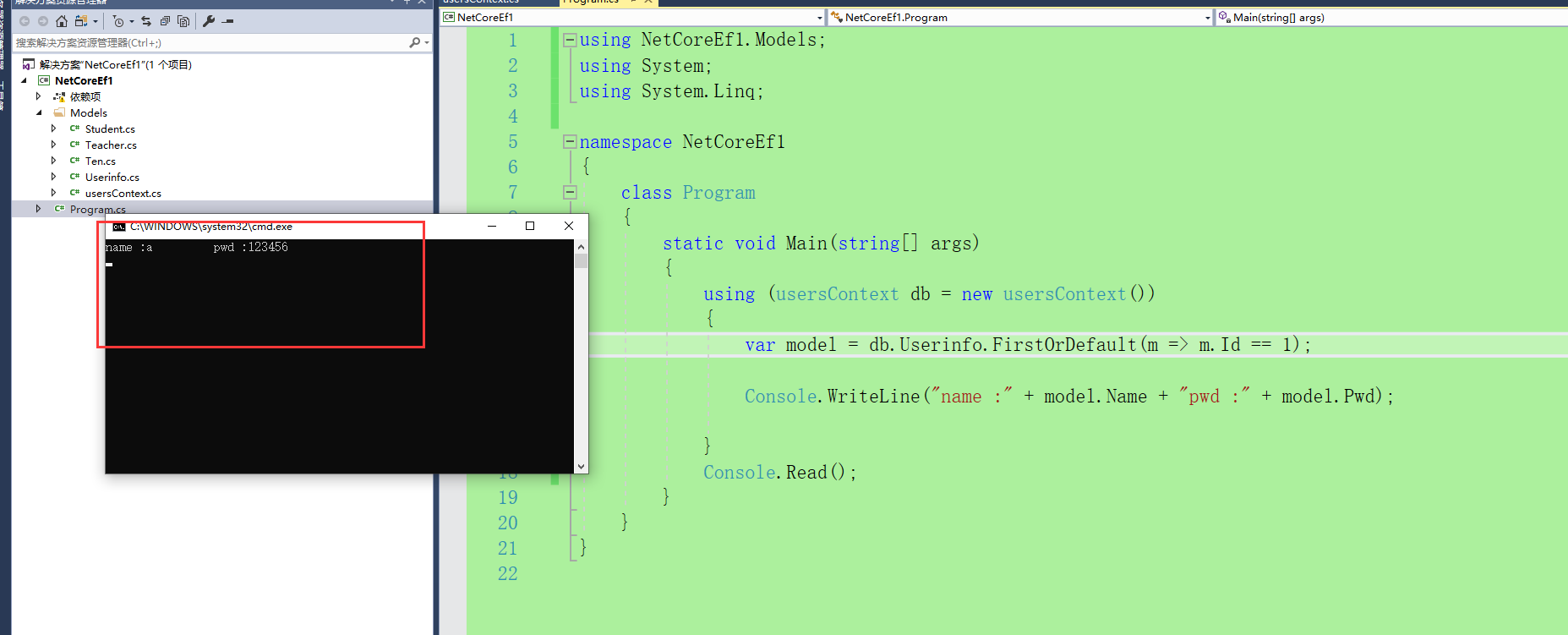 (4)Scaffold-DbContext "Server=.;Database=users;Uid=sa;Pwd=123456;" Microsoft.EntityFrameworkCore.SqlServer -OutputDir Models
