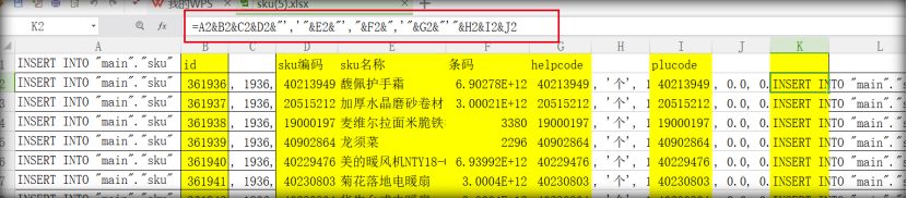 (5) 数据加工,打开excel表,把数据拼接成sql语句。这里的黄色代表需要更新的,有一定的对应关系(我是直接把广磊给我的数据复制进去),需要注意sku名称需要去除特殊字符。