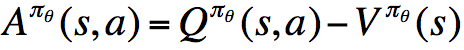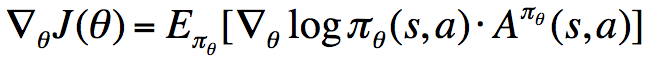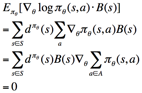 该式表明,对于某一个与动作a无关的基准函数B(s),它乘以score function之后,计算在策略下的期望,结果为0。换句话说,我们可以在奖励函数的梯度的基础上任意的增减一个这样的式子,而保持梯度不变。一个不错的Baseline函数就是值函数,在原奖励函数梯度的计算式上减去该值,得到:![]()