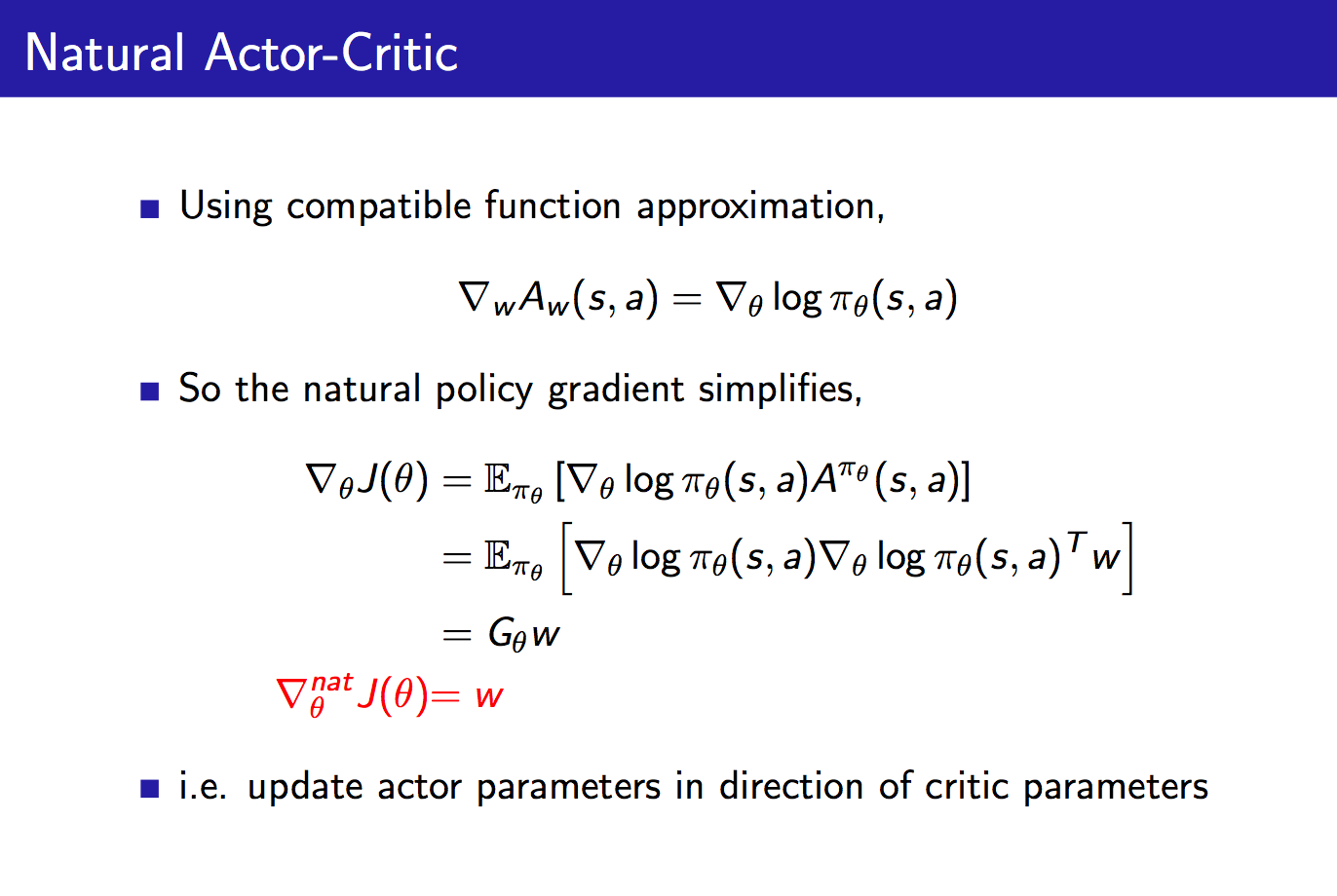在上面的推导中,我们可以将compatible function approximation积分代入对于奖励函数的求导中,得到最终的奖励函数的自然梯度,发现它就等于Critic的参数w,这并不是巧合,当我们结合natural policy gradient + compatible function approximation(自然策略梯度+相容函数逼近)之后,就可以得到这一结论:对Actor参数的更新就等于Critic的参数。