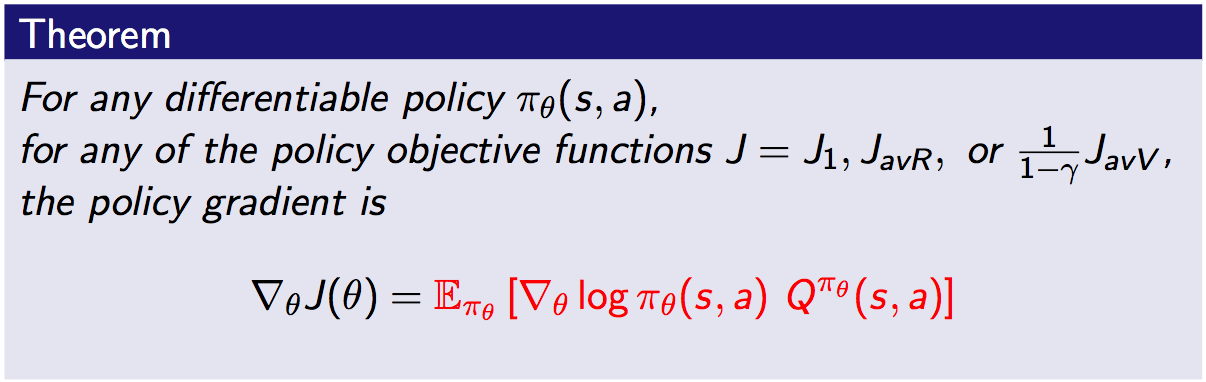 与上面的one-step MDP的情形相比,这里将其拓展到了multi-step MDP,并且将即时奖励r替换为了long-term值函数,这一定理非常重要。我们知道,我们对于策略参数的更新都是沿着极大化奖励函数的方向进行的,所以由上式我们可以对参数进行更新。