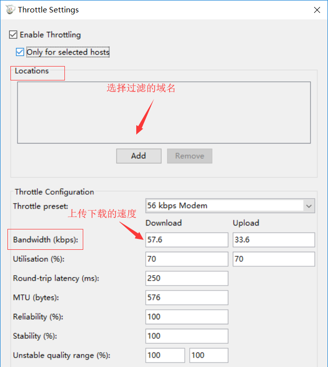 1.打开Charles,Proxy->Throttle Setting,设置上传下载速度