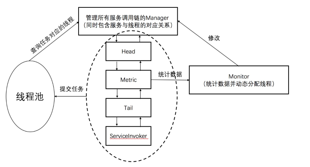 借鉴了传统的RPC框架的实现原理后,我们只需要修改或者增加三样东西,就可以完成上述的功能,分别为:线程池、数据监控节点Metric和线程动态分配的Monitor。这三者之间的关系可以先看一下这张图有个大概的印象。
