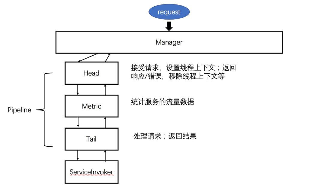 而至于监控节点的形式,根据调用链路的具体实现不同,在Dubbo中可以是一个filter,而我因为将调用链路抽象为一个Pipeline,所以它作为Pipeline上的一个节点,参考下图: