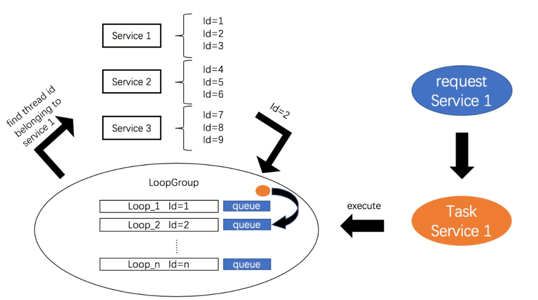 私以为核心在于维护服务与线程id的对应关系,以及在请求到来时,LoopGroup会根据请求中服务的类型,选择对应id的线程,并交由该线程去处理请求。