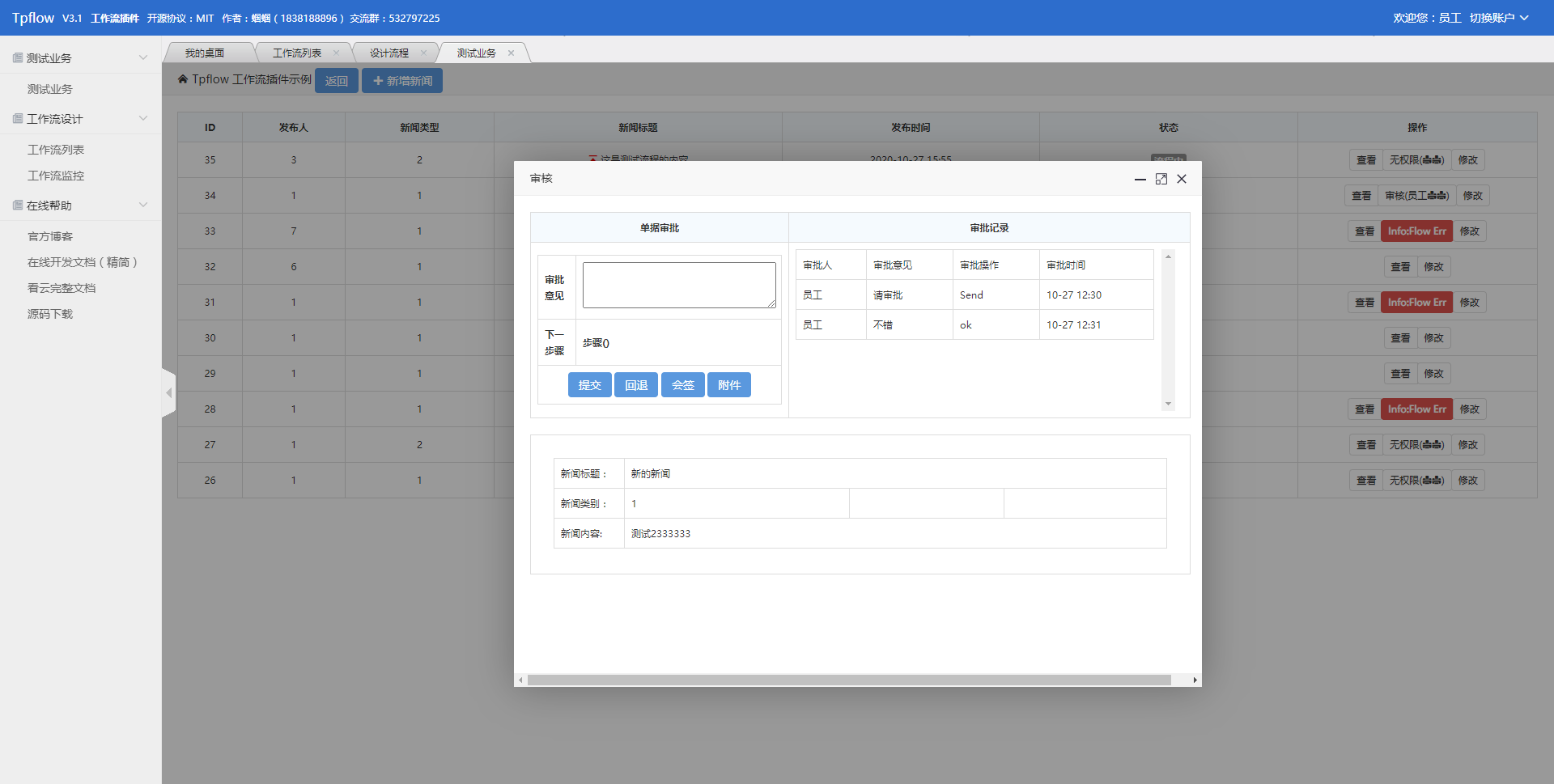 TpFlow工作流引擎是一套规范化的流程管理系统,基于业务而驱动系统生命力的一套引擎,我们命名位工作流引擎。流引擎的存在是为了彻底释放整个信息管理系统的的活力,让系统更具可用性,智能应用型,便捷设计性。而Tpflow团队的存在是为了打造中国最优秀的PHP工作流引擎。