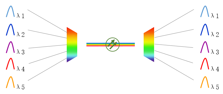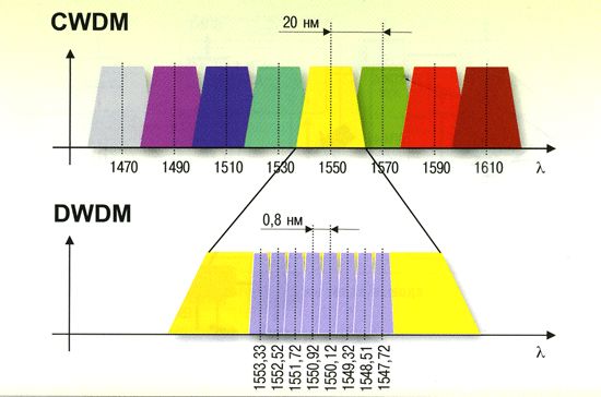 后来,技术越来越先进,波长间隔压得越来越短,到了几nm的级别,就成了紧密的WDM,叫做密集波分复用,就是DWDM(Dense WDM)。